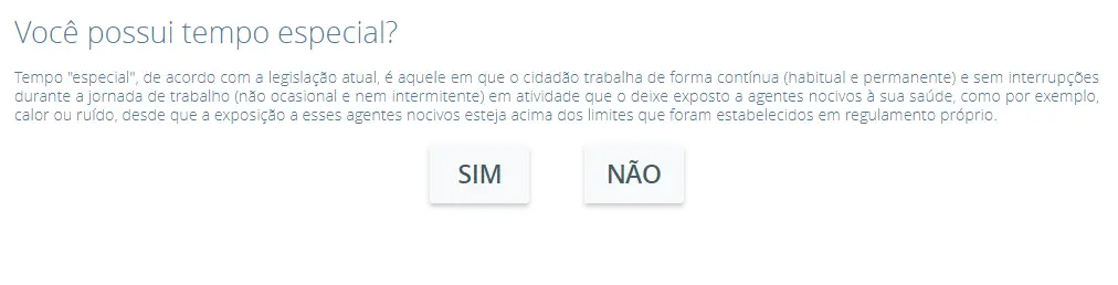 Entre as questões estão: “Você possui tempo especial?”, “Você possui tempo rural?”, “Você possui tempo trabalhado em outro país (exterior)?”, “Você já trabalhou como professor?” e “Você já trabalhou como militar e/ou funcionário/servidor público da União, Estado ou Município?”.
