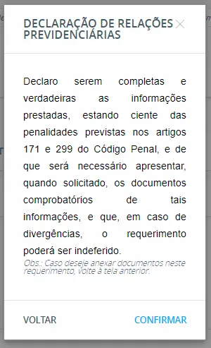Então, o sistema do INSS mostrará uma lista de empresas trabalhadas e contribuições realizadas. Caso seja necessário, é possível editar as informações. Ao clicar em “Avançar” é necessário confirmar uma declaração de relações previdenciárias.