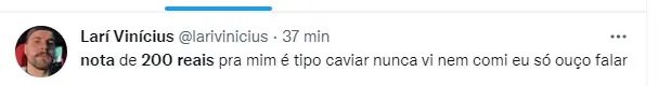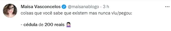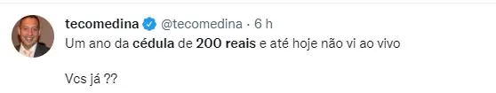 Nas redes sociais, a raridade da nota já virou meme. “nota de 200 reais pra mim é tipo caviar nunca vi nem comi eu só ouço falar”, escreveu um seguidor. “Coisas que foram um surto coletivo: nota de 200 reais”, brincou outro.