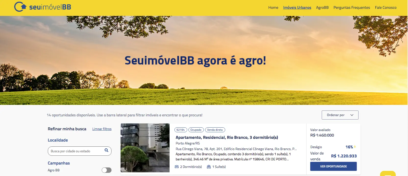 Todos as oportunidades anunciadas estão quitadas e não possuem dívidas. Para ver as opções, é preciso acessar o site www.seuimovelbb.com.br e selecionar os tópicos “Imóveis urbanos” ou “AgroBB”, destacados no canto superior da tela, para acessar a plataforma de imóveis com desconto.