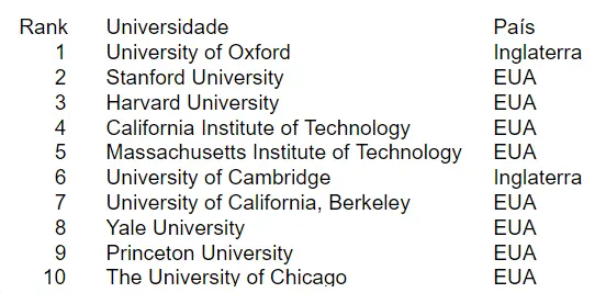 Oxford, Stanford, Harvard e MIT lideram a lista, universidades tradicionalmente muito procuradas por estudantes de todo o mundo. Deste modo, segue a lista segundo a pesquisa Times Higher Education: