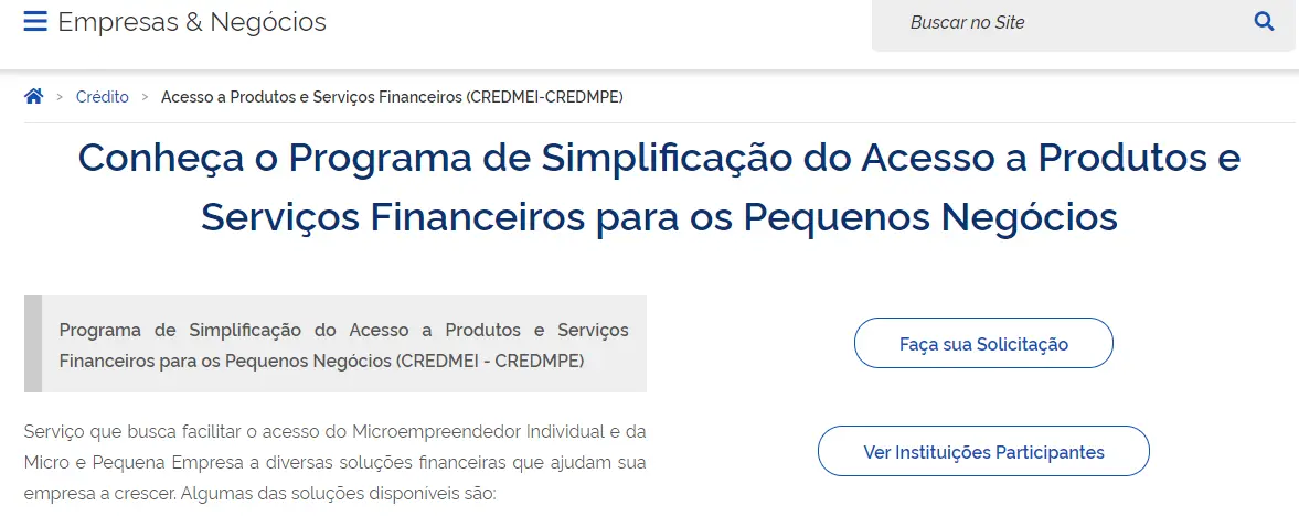 Outra possibilidade de crédito para MEI é o Programa de Simplificação do Acesso a Produtos e Serviços Financeiros para os Pequenos Negócios (CREDMEI). Trata-se de um serviço com o objetivo de facilitar o acesso do MEI e de pequenas empresas a variadas soluções financeiras.
