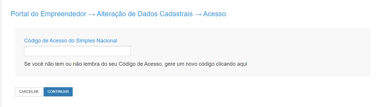 Para continuar o processo de alteração, é preciso informar o código de acesso do Simples Nacional. Quem não tem ou não se recorda do código, pode gerar um novo e continuar o procedimento.