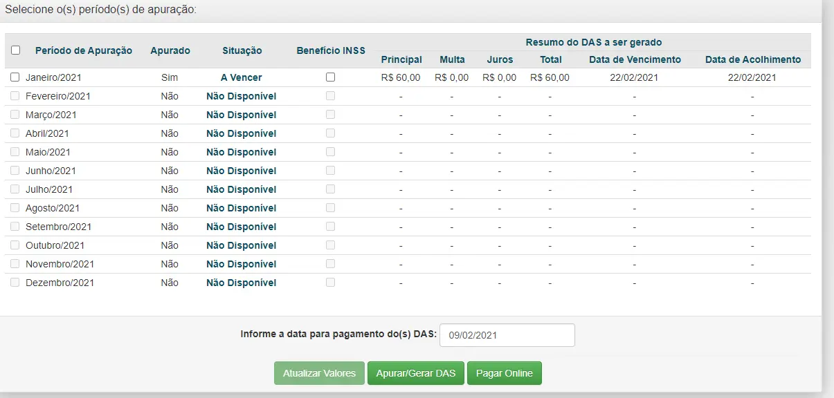 Feito isso, aparecerão os meses de apuração, bem como a situação da guia DAS MEI, data de vencimento, valor total, juros e multa se houver. O empreendedor deve selecionar os meses que deseja pagar e informar uma data para o pagamento. Então apertar em “Apurar/Gerar DAS”.