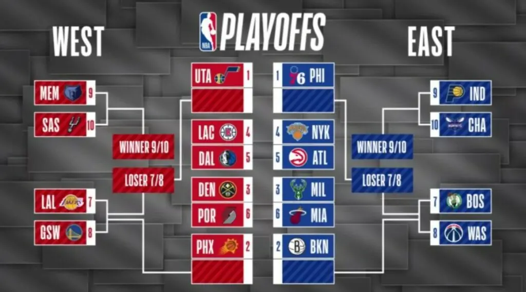 Na NBA, as equipes são divididas em duas Conferências, a Leste e a Oeste, contabilizando 15 equipes em cada uma delas. Ao todo, oito equipes se classificam para os playoffs da NBA. Entretanto, no ano passado, a liga decidiu criar o torneio de repescagem intitulado Play-In, com a intenção de não prejudicar equipes com a pandemia do coronavírus.