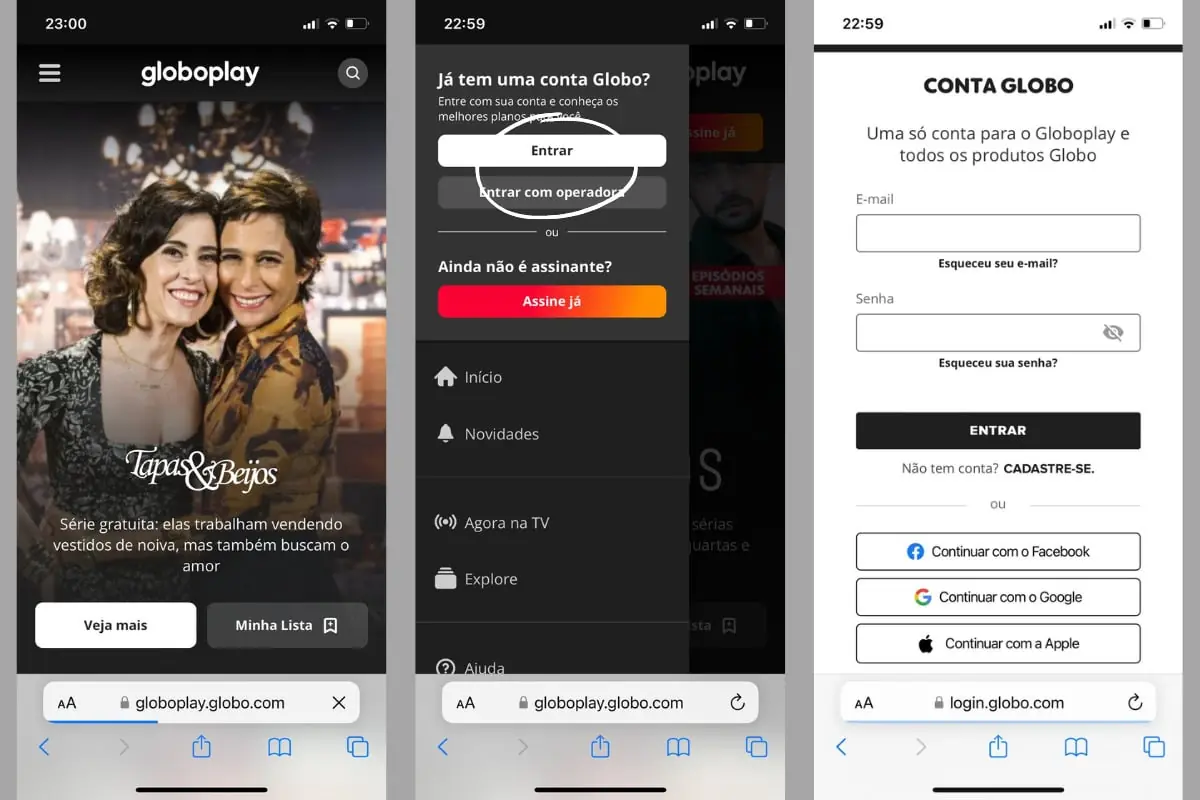 1) Entre no aplicativo ou no site www.globoplay.globo.com e vá até o menu principal. Depois, escolha a opção “entrar”.