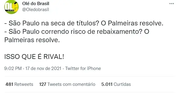 O São Paulo venceu na noite desta quarta-feira (17/11) o Palmeiras por 2 a 0 jogando no Allianz Parque, capital paulista, pela 33ª rodada do Brasileirão. Com gols Gabriel Sara e Luciano, o tricolor conquistou os três pontos e segue na luta para escapar do Z-4. Com o resultados, torcedores aproveitaram para postar memes do São Paulo e Palmeiras para comemorar a vitória de hoje.