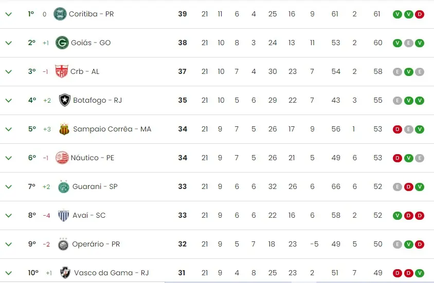 No último domingo, 29 de agosto, venceu a Ponte Preta por 2 a 0 em casa. Ao todo, o Vasco tem apenas quatro pontos a menos do que o último colocado do G4. Com relação ao líder, a diferença é de oito pontos.