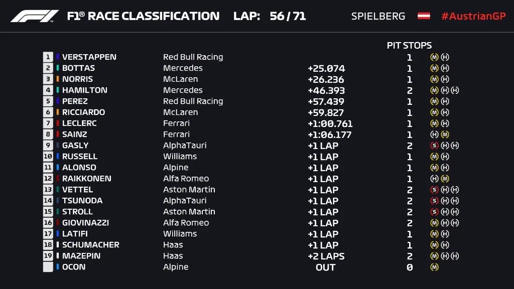 Mais uma vez, Max Verstappen foi o grande destaque nas pistas da Fórmula 1. Liderando a etapa, o piloto da Red Bull conseguiu manter-se em primeiro lugar por parte do tempo, até fechar as 71 voltas na Áustria, ou seja, em casa com a equipe.