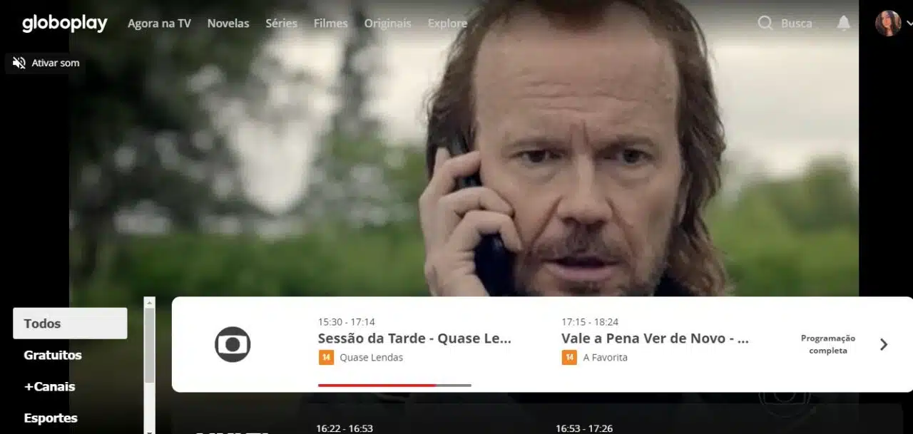 Pelo computador é bem simples. Basta acessar o site www.globoplay.globo.com, encontrar o ícone de “Agora na TV”, na parte superior à esquerda, escrito em branco.