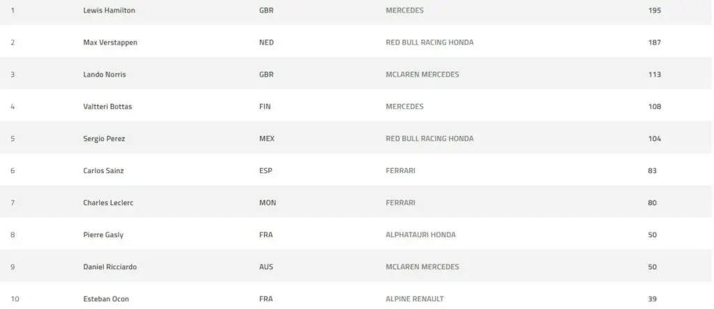 O britânico Lewis Hamilton ultrapassou o seu grande rival na temporada, o holandês Max Verstappen, e agora segue em primeiro lugar na classificação geral. Entretanto, o piloto da Red Bull vem logo atrás com a diferença de apenas 8 pontos entre os dois.