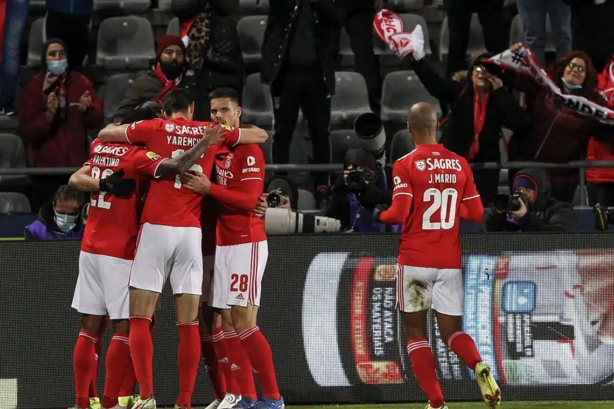 Escalação do jogo do Benfica: Vlachodimos (Helton Leite); Vertonghen, Grimaldo, Otamendi, Lazaro; Taarabt, Bernardo, Diogo Gonçalves, Everton; Gonçalo Ramos, Yaremchuk