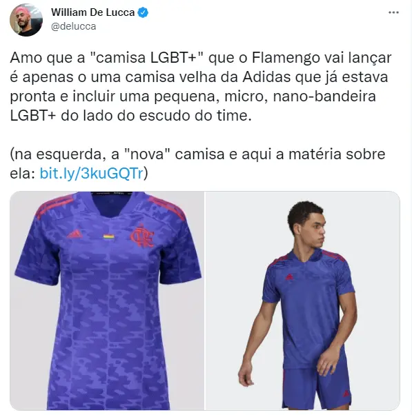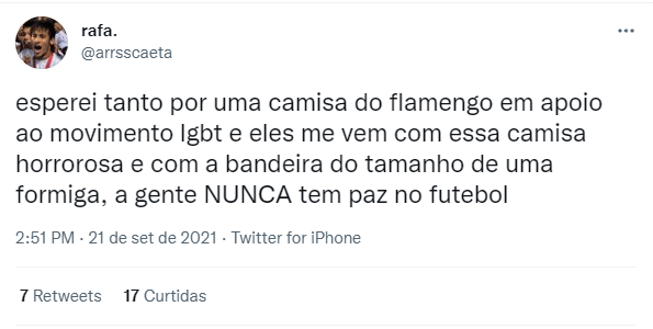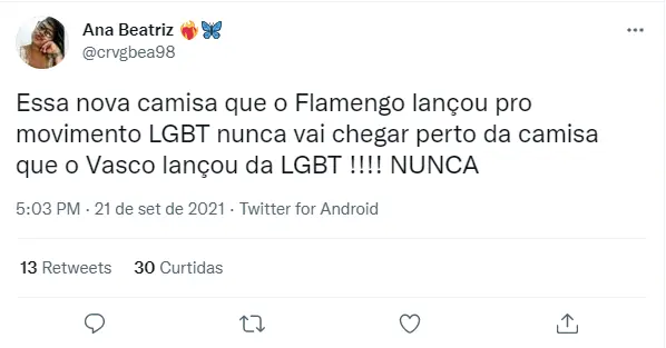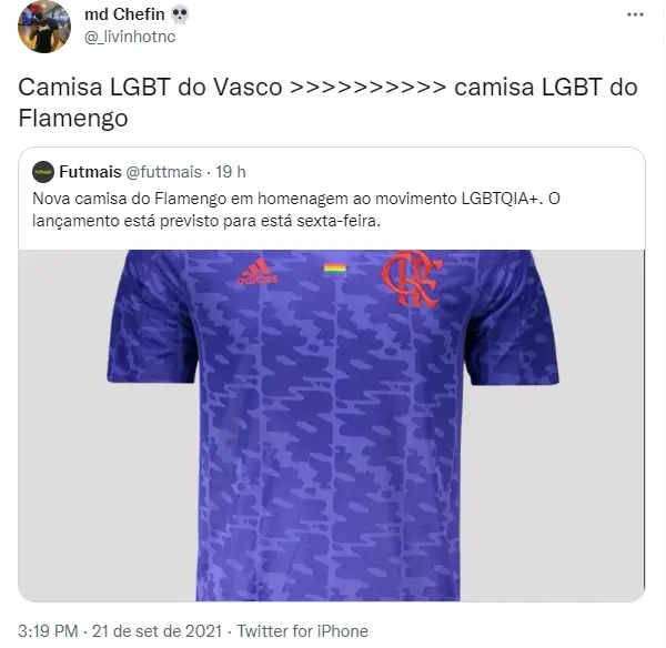 Na internet, muitos torcedores compararam a camisa que o Vasco fez em apoio ao movimento LGBTQUIA+, com a do Flamengo em 2021. Na opinião da maioria, a do clube Rubro-negro não agrada em razão do tamanho pequeno da bandeira da causa na vestimenta. Confira então abaixo a reação de alguns torcedores: