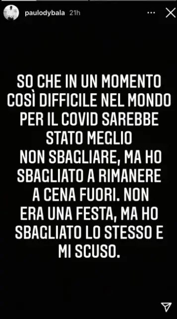 Através de post em seu Instagram, o atacante Dybala se desculpou sobre o ocorrido na última semana. Segundo o jogador, a ocasião foi simplesmente um jantar, e não uma festa.