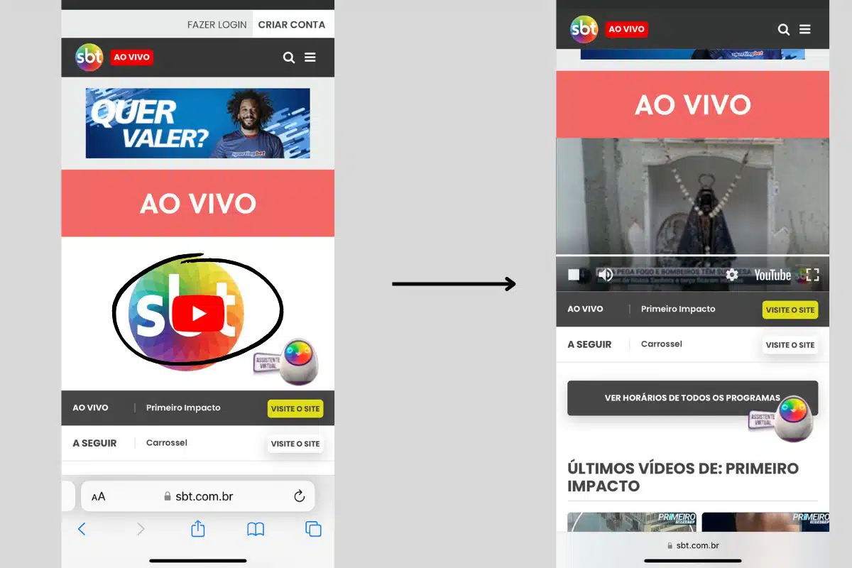 1 – Acesse o site www.sbt.com.br tanto pelo navegador do celular como pelo computador, como preferir. Não é necessário logar ou criar contas para assistir ao vivo as imagens do canal pelo site. Ao abrir o portal do SBT, procure pelo ícone “AO VIVO”, escrito em vermelho e branco no lado esquerdo na parte de cima do site e clique em cima.