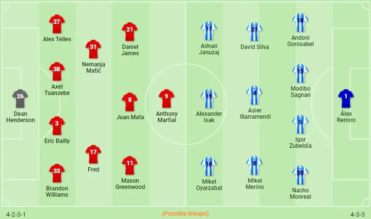 Possível Manchester United: Henderson (De Gea); Williams, Tuanzebe, Telles, Bailly; Matic, Fred; Daniel James, Mata, Greenwood; Martial.