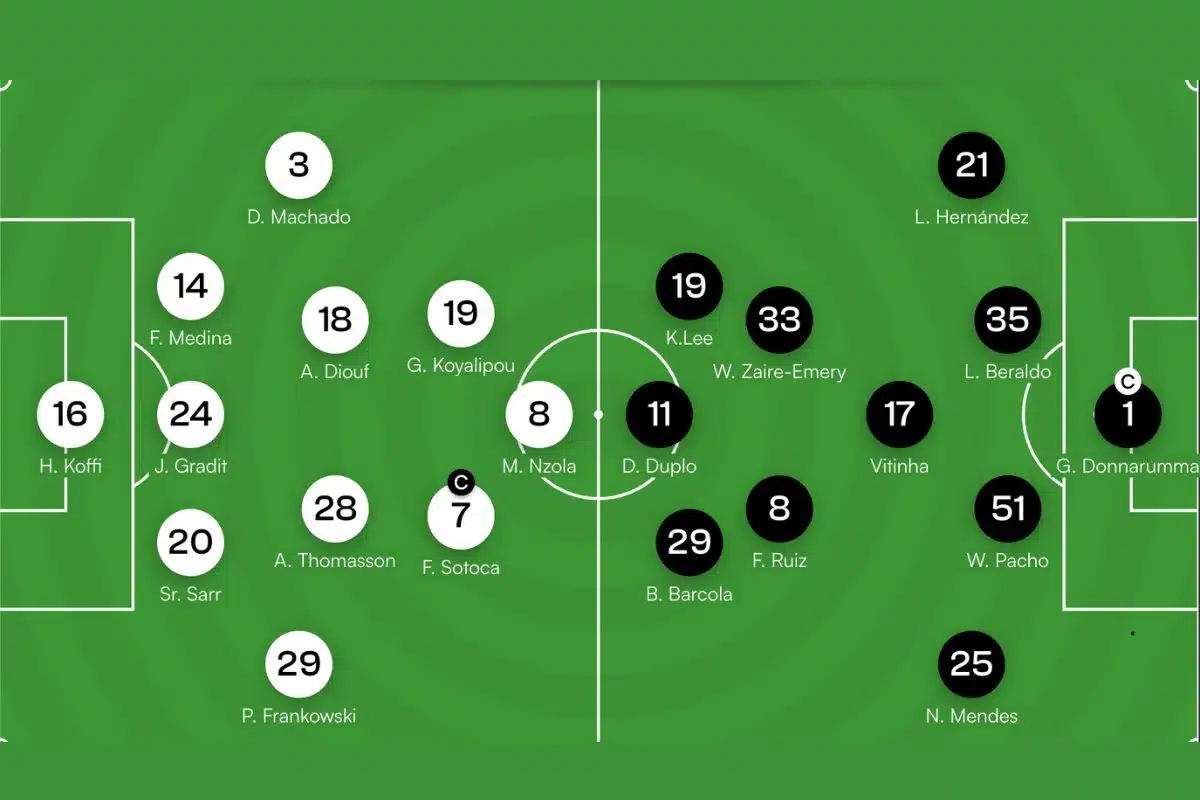 PSG tem em campo os jogadores Donnarumma; Hakimi, Beraldo, Hernández, Nuno Mendes; Lee, Fabián Ruiz, Mayulu; Dembélé, Gonçalo Ramos, Barcola. Técnico: Luis Enrique.