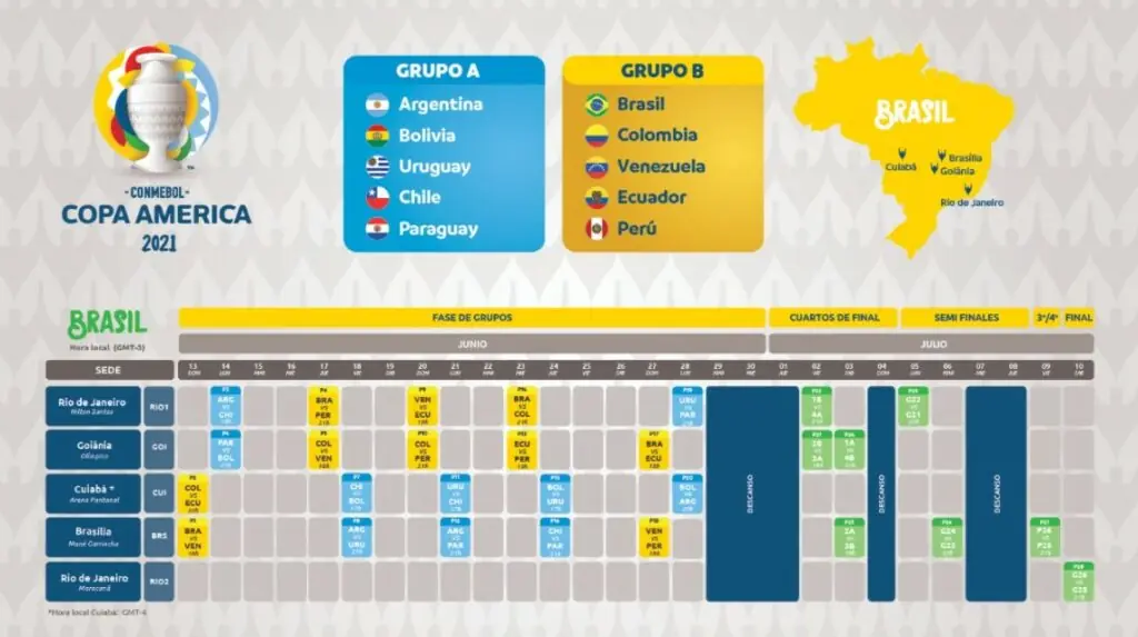 Em meio a polêmicas, a Conmebol confirmou a realização da Copa América 2021 no Brasil, entre os dias 13 de junho até 10 de julho, incluindo quatro cidades-sede, sendo Brasília (DF), Rio de Janeiro (RJ), Cuiabá (MT) e, por fim, Goiânia (GO). Confira quando a Seleção Brasileira joga e os horários de cada um dos jogos.