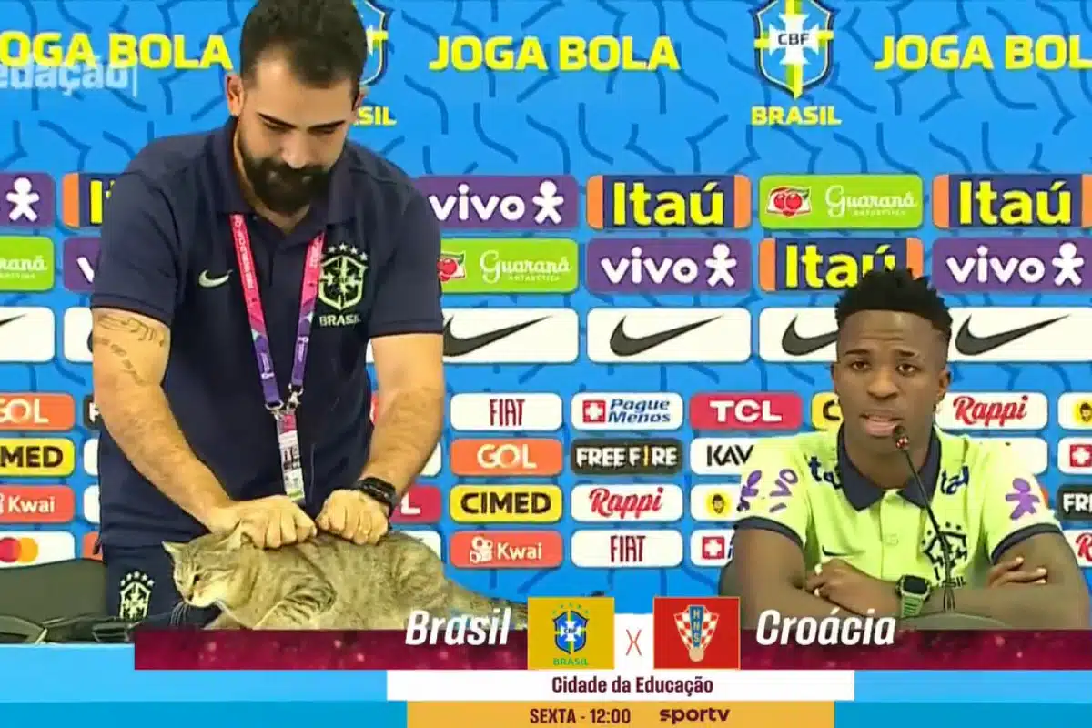 Um pequeno intruso apareceu na entrevista coletiva de Vini Jr nesta quarta, 7 de dezembro. Enquanto o astro respondia perguntas dos jornalistas, um gato subiu na bancada da Seleção. Veja o momento que o gato invade entrevista e é retirado por funcionário da CBF. O vídeo rodou as redes sociais, gerando muita revolta e críticas dos torcedores.