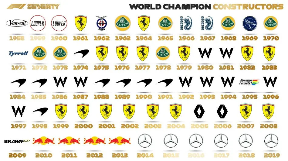 Do outro lado, na lista da competição de construtores, a Ferrari comanda as estatísticas com 16 títulos conquistados. A primeira vitória aconteceu em 1961, sob o comando do americano Phil Hill.