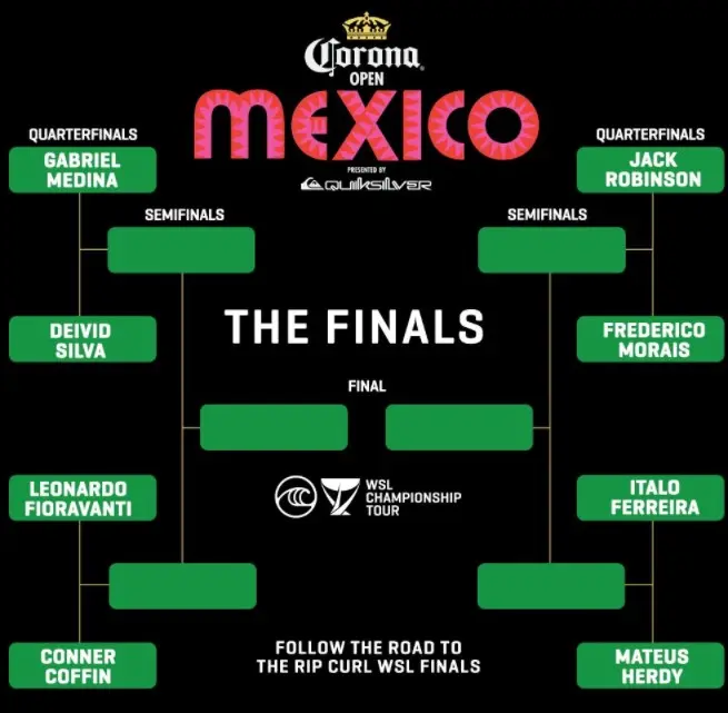 A surpresa das quartas de final na etapa do México foi a derrota de Gabriel Medina para Deivid Silva, seu compatriota. Com as notas de 13.14 contra 15.34, Deivid avançou para as semifinais da competição pela primeira vez na carreira para enfrentar o italiano Leonardo Fioravanti.
