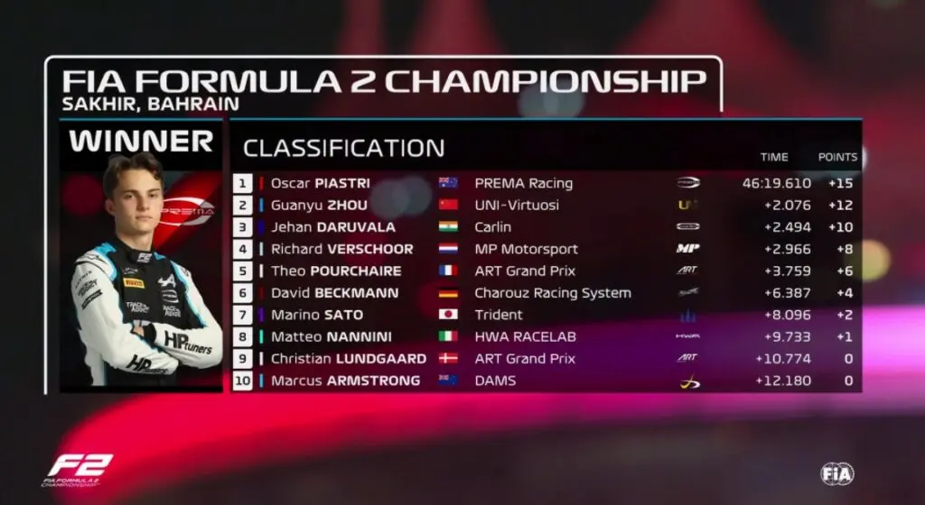 A segunda corrida da etapa do Grande Prêmio de Bahrein na Fórmula 2 acontece na tarde do último sábado (27). O jovem australiano Oscar Piastri ficou em primeiro lugar, ultrapassando o chinês Zhou por segundos.