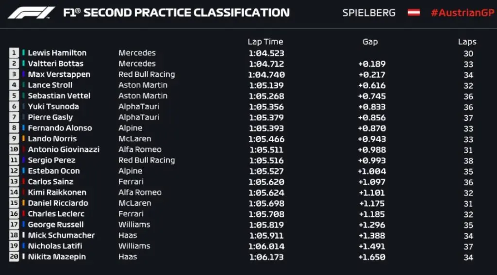 Já o segundo treino foi marcado pela vitória de Lewis Hamilton, da Mercedes, sob o tempo de 1m04s523, com Bottas, da mesma marca, em segundo lugar e, por fim, Max Verstappen em terceiro, fechando o pódio da corrida treino na etapa pela Áustria.