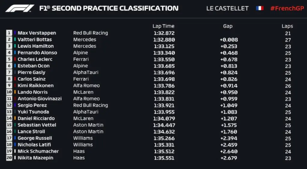 Resultado do segundo treino livre da F1 na França em 2021