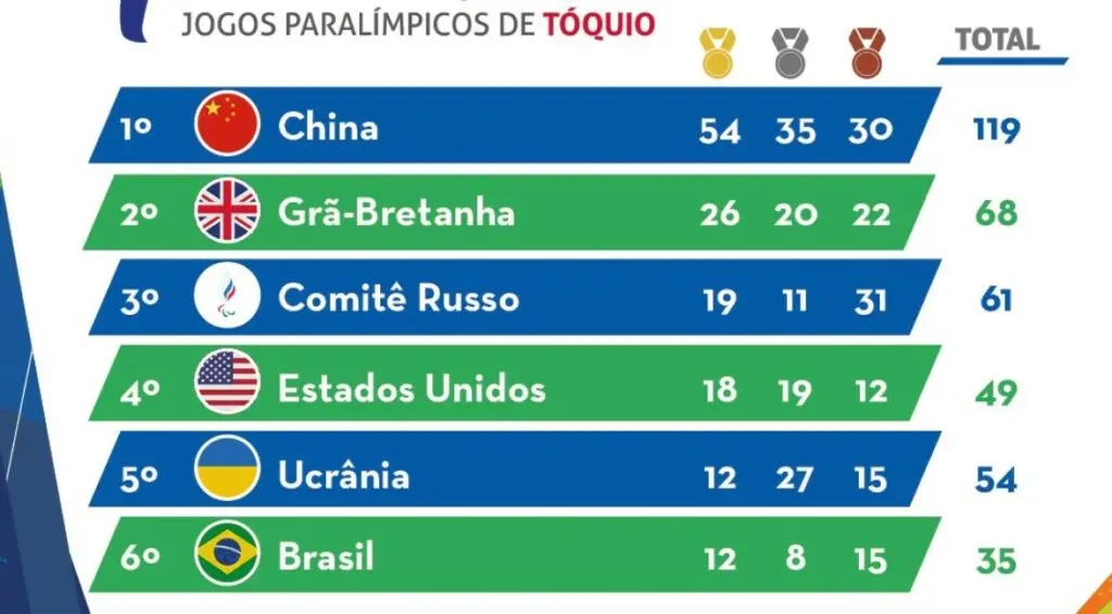 Neste momento, o Brasil ocupa a 6ª posição do quadro geral de medalhas nos Jogos Paralímpicos de Tóquio em 2021, totalizando 35 medalhas com 12 de ouro, 8 em prata e 15 de bronze.
