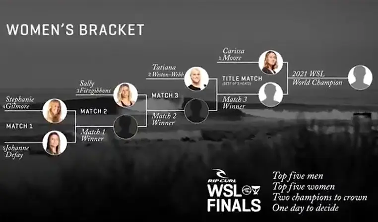 Enquanto isso, o feminino também segue o mesmo modelo de qualificação até a grande final do Mundial onde a primeira colocada na classificação geral aguarda por sua adversária na última etapa. No caso, é a norte-americana Carissa Moore a líder do ranking.