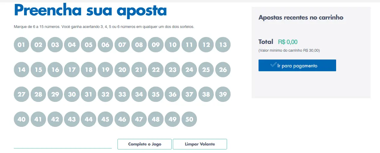 Então, para jogar, o apostador deve escolher de 6 a 15 números, do total de 50 disponíveis.