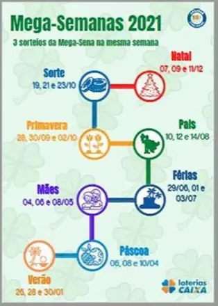 Para 2021, foram programadas oito Mega-Semanas: de Verão, em janeiro; de Páscoa, em abril; das Mães, em maio; de Férias, em julho; dos Pais, em agosto; de Primavera, em setembro; da Sorte, em outubro; e de Natal, em dezembro. Confira na imagem abaixo as datas: