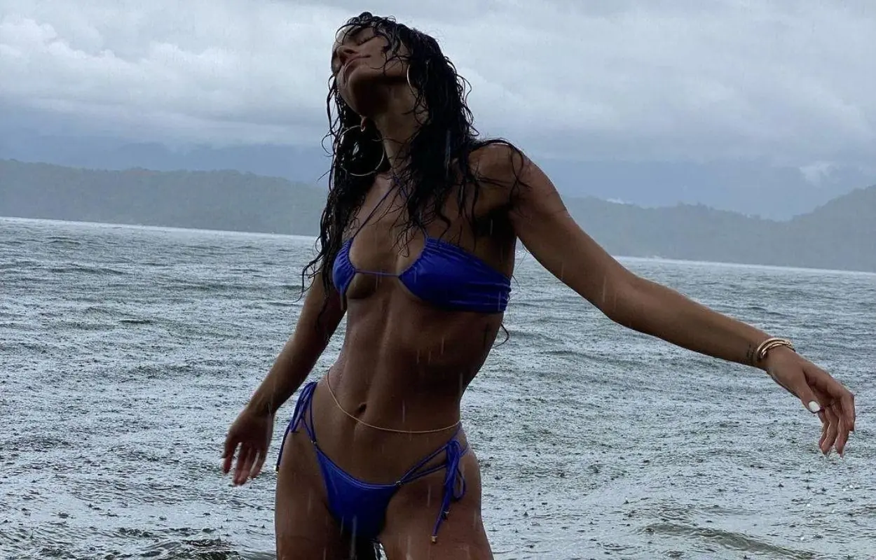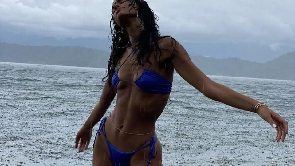O jeito diferente de vestir o top pode combinar com outra amarração de biquíni que está bombando entre as famosas e fashionistas. Repare que as tiras longas da lateral da calcinha da Luísa Sonza serviram para cruzar na barriga, conferindo estilo. A ideia ainda fez com que a parte de baixo ficasse mais cavada, outra tendência do momento.