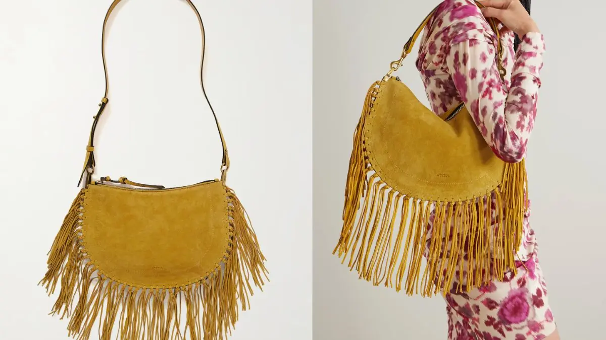 Em 2026, o interesse por peças “com franja” está em seu nível histórico mais alto. A “calça jeans com franja” lidera as buscas relacionadas, enquanto “bolsa de mão com franjas” e “bolsa transversal com franjas” registram frequência recorde — o acessório como protagonista cinético, que vive no gesto de quem o usa.