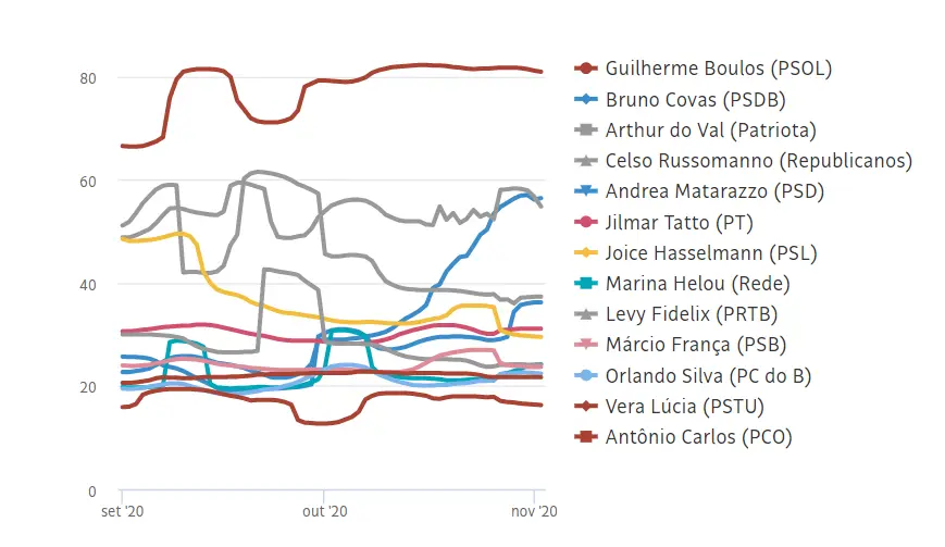 No levantamento para as eleições 2020, divulgado inicialmente em 7 de outubro e atualizado em 4 de novembro, Boulos aparece liderando, enquanto a disputa pela segunda colocação está entre o atual prefeito e candidato à reeleição, Bruno Covas (PSDB), e Do Val.