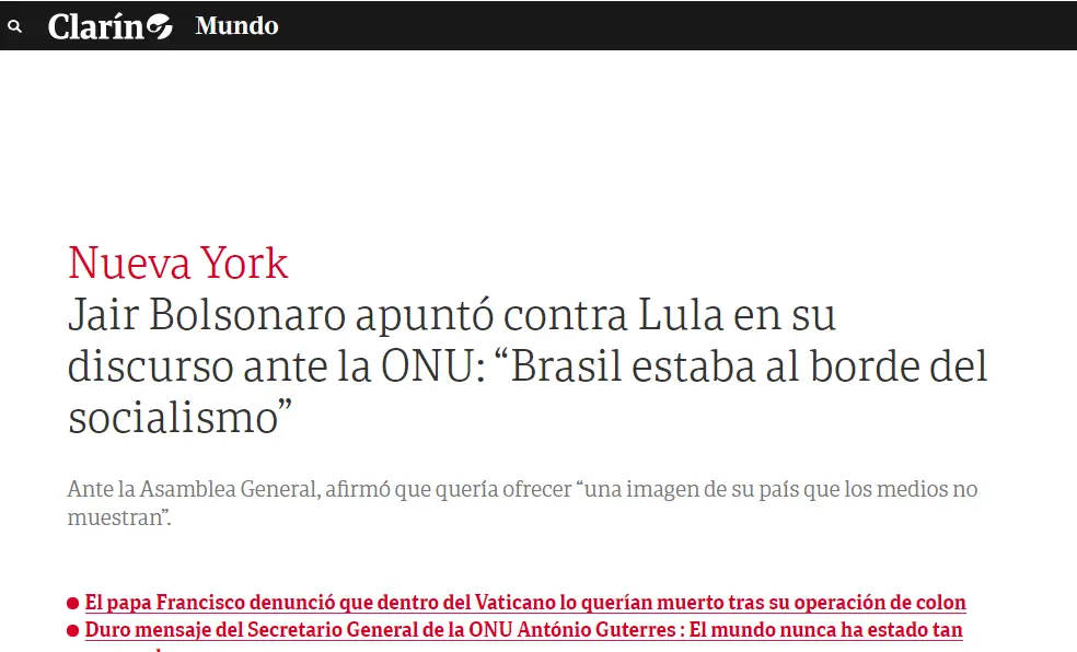 O jornal da Argentina “Clarín” publicou que Bolsonaro mirou contra o ex-presidente Lula, durante o discurso na ONU, quando disse que o Brasil estava “à beira do socialismo”.
