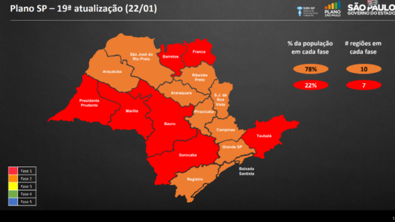 Sete regiões do estado vão para a fase vermelha e as outras dez, incluindo a Grande São Paulo, para a laranja. A atualização do Plano de SP vale a partir da próxima segunda (25) e vai até o dia 7 de fevereiro.
