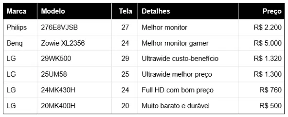 <span”>Na tabela abaixo listamos os melhores monitores à venda.